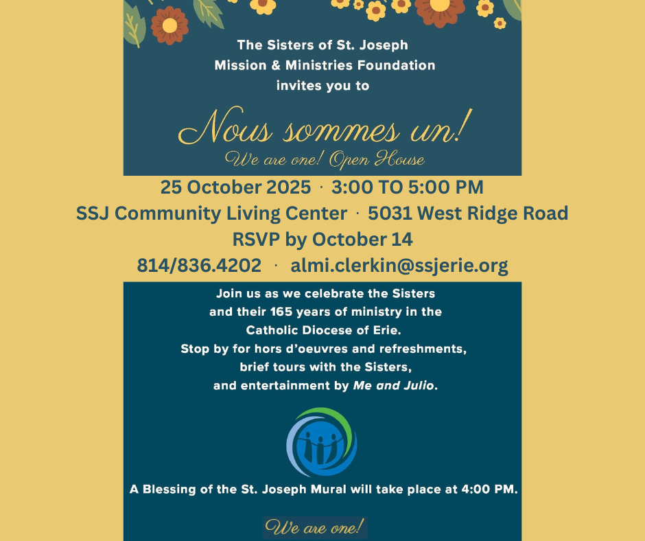 The Sisters of St. Joseph of Northwestern Pennsylvania are women who affirm their mission of unity of neighbor with neighbor and neighbor with God. Moved by the love of the Spirit the Sisters commit themselves to constant response to the ever-changing needs of the world.
